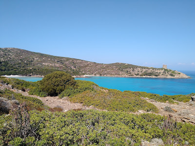 La giornta coperta ci ha fatto solo intuire i colori che effettivamente l'isola regala e di cui abbiamo potuto godere sabato 11 quando siamo tornati sull'isola partendo da Porto Torres con traghetto per Cala Reale. Da li abbiamo preso un pulmino (15 biglietto euro 15 per l'intersa giornata ma con 3/4 corse totali) fino a Cala D'Oliva. Avevamo deciso di arrivare al Faro di Punta Scorno tramite il sentiero circolare che però volevamo fare in senso contrario a quello suggerito per poter fermarci per un bagno alla fine del percorso a Cala Sabina. Dopo circa 2 km di cammino abbiamo incontrato Franco, un guardia parco, che si è fermato con la sua jeep e ci ha chiesto se volevamo un passaggio a Punta della Scomunica. Non ce lo siamo fatti ripetere e per fortuna!!! Nel tragitto abbiamo visto una splendida upupa! Inoltre, probabilmente, non saremmo andati in quella direzione e avremmo perso un panorama unico a 360 gradi che permette di ammirare tutta l'isola nella sua intera lunghezza. Dopo alcune foto e ringraziamenti a Franco siamo scesi verso Elighe Mannu e, nonostante le indicazioni di Franco, abbiamo sbagliato strada: invece di seguire il sentiero (non segnalato ma soprattutto nascosto) per il Faro siamo arrivati (passando per un bel bosco) a Case Bianche. Purtroppo ci siamo accorti dopo un po che non c'era modo di tagliare la strada appena percorsa e quindi abbiamo ripreso il sentiero in senso opposto e abbiamo incrociato due cinghialini con la loro madre.